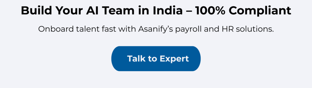 Whether you’re hiring your first ML engineer or building an entire AI function, Asanify’s EOR solution helps you hire quickly, pay compliantly, and scale with zero HR risk.